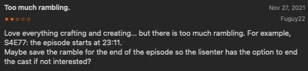 In this episode, I read a recent negative review on itunes about my podcast. It was a 2 star rating and the review was not good. The reviewer said that I ramble too much and was disappointed that the “episode” started 23 minutes into the podcast. I respond to this review in the podcast. If you have been a long time listener of my podcast, you know that I alternate guest episodes with solo episodes. The reviewer was not familiar with my long form format, and was not aware that in my solo episodes, the entire episode can be chit chat….or as the reviewer called it…”too much rambling”.