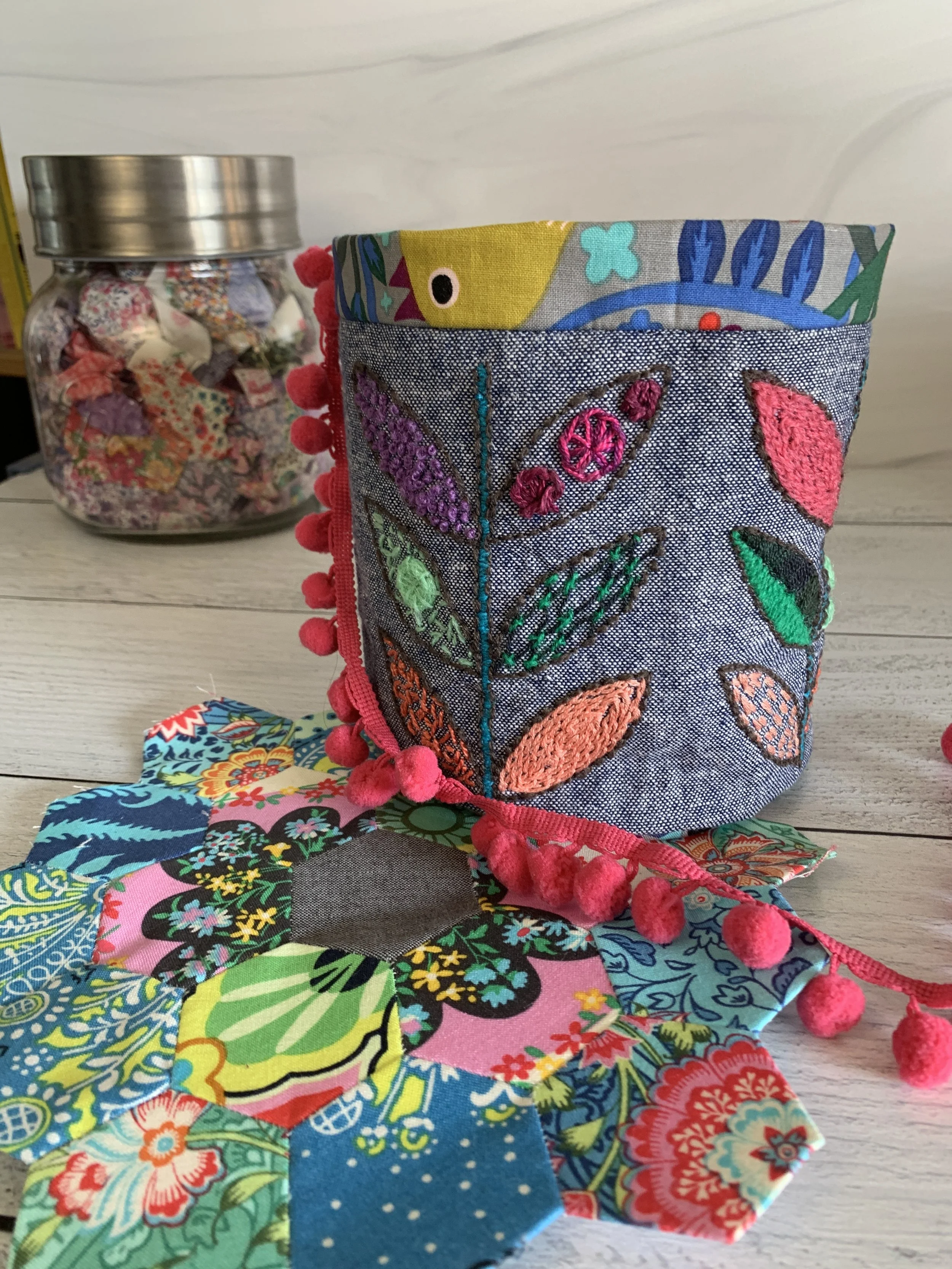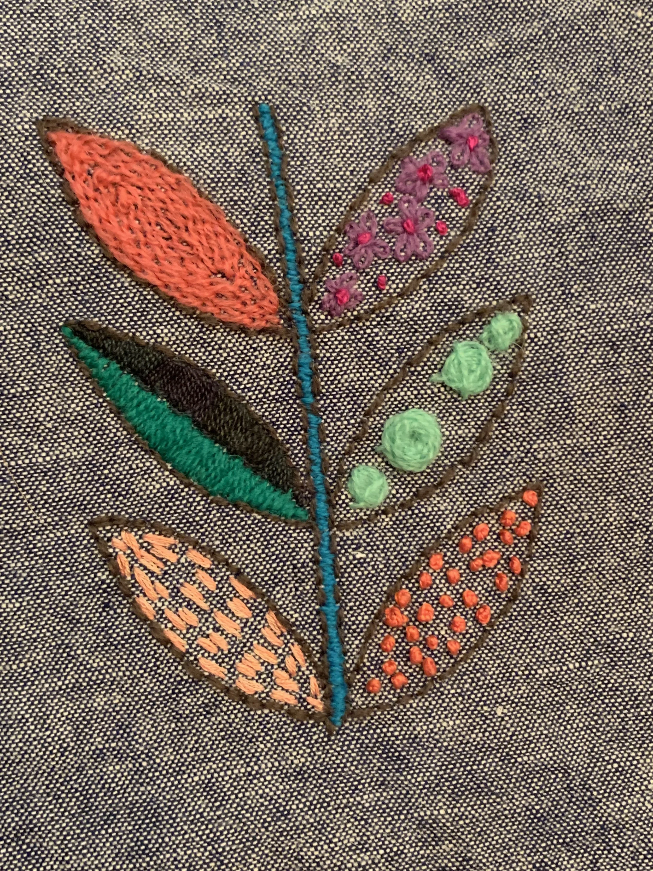 I completed the Tendrils Pot from the Modern Crewel Embroidery book by Jo Avery. The hand embroidery took about 4 evenings and sewing everything together took about 30-45 mins. I used a mix of embroidery threads: wool crewel thread, Sajou embroidery floss, DMC floss and perle cotton thread. My Amazon affiliate link to the book and the printable Stitch and Stick paper are below.