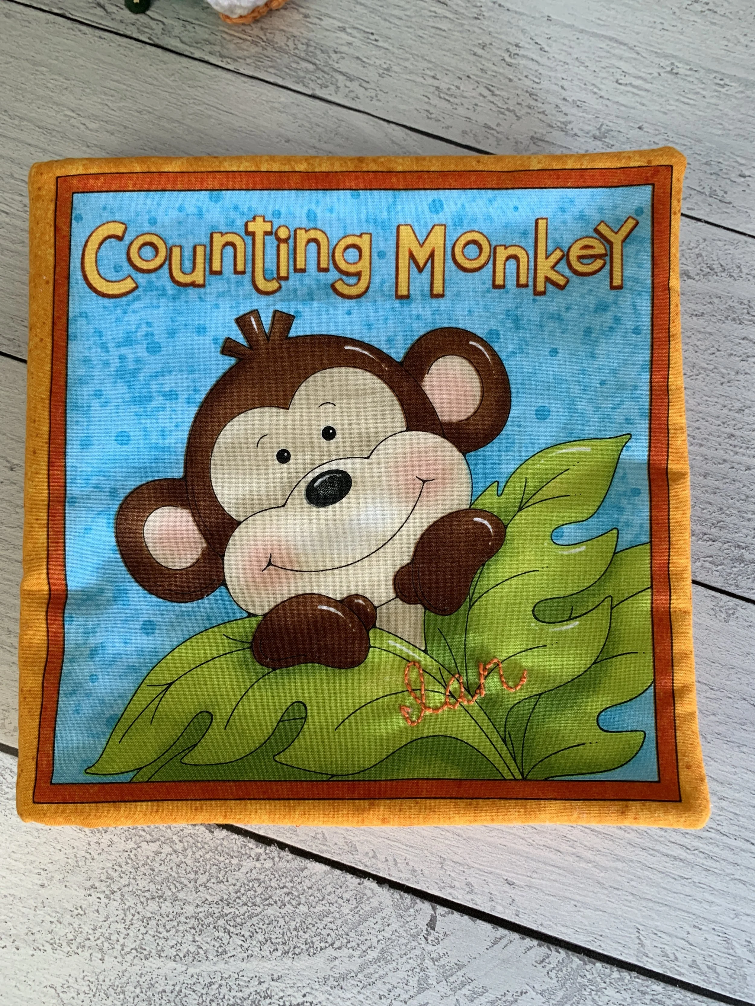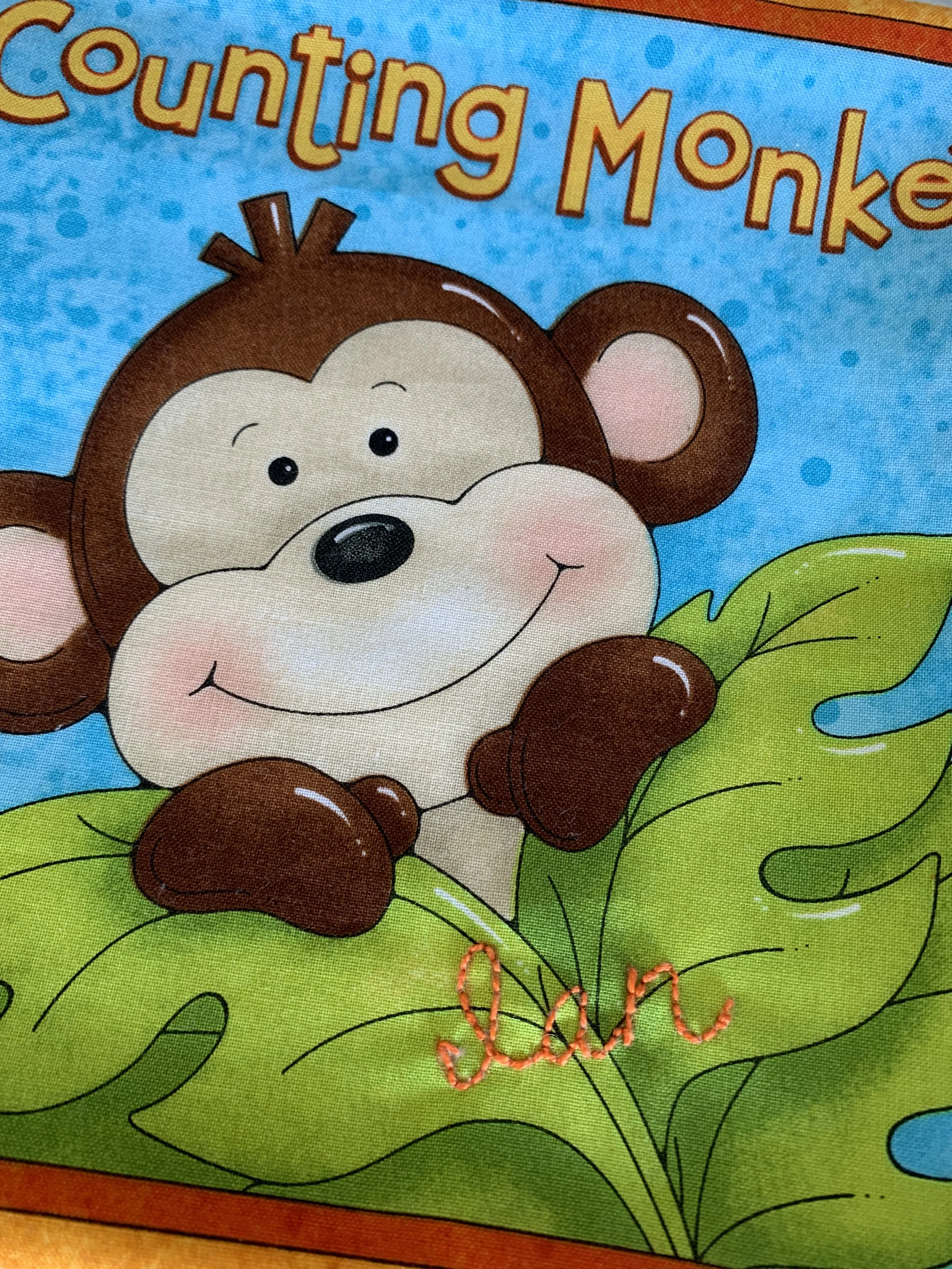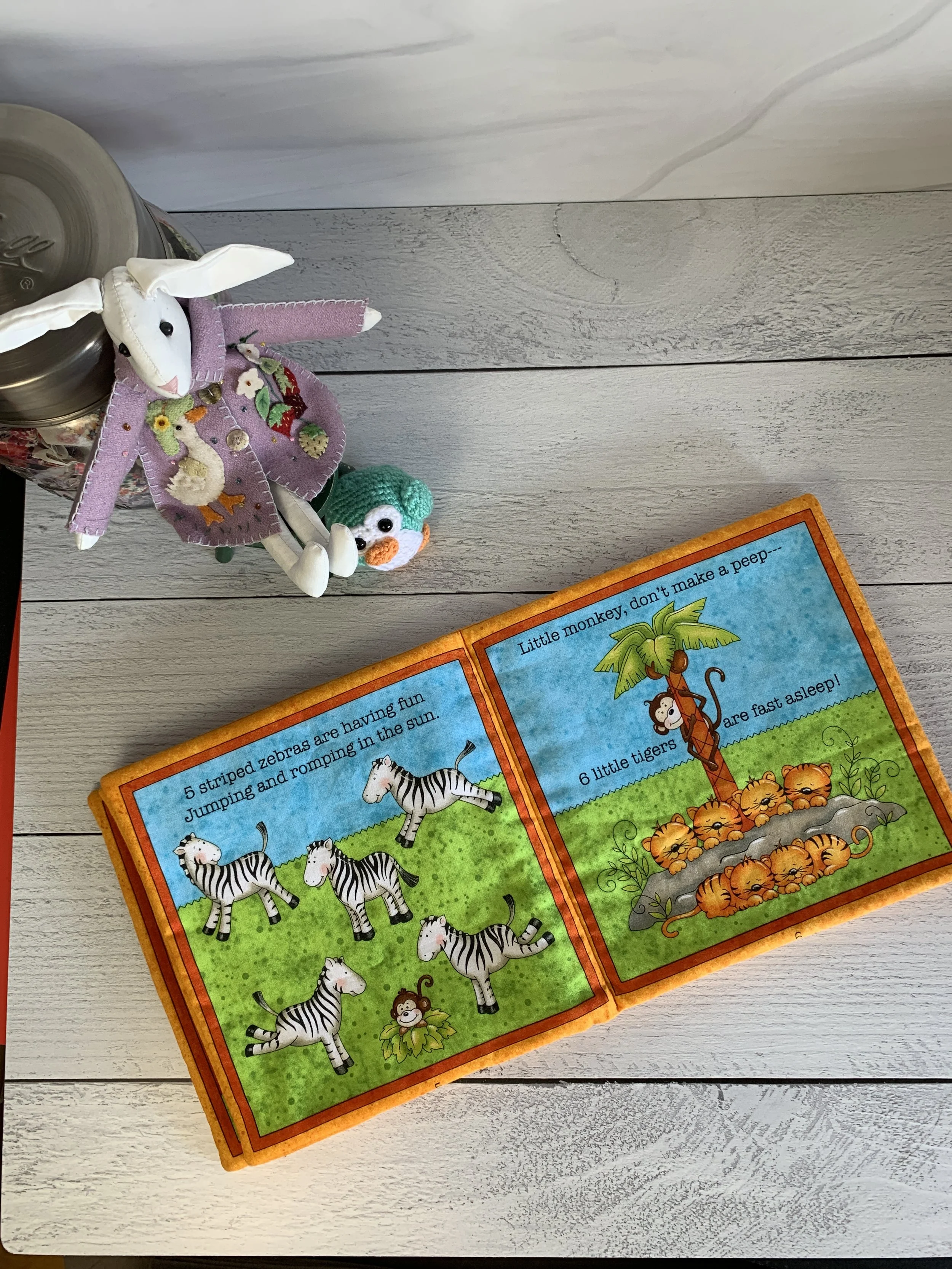 The final small project I made is a fabric book from a pre printed fabric panel. This one is for my 2 yr old nephew, Ian. This project only requires batting, and sews up super quick. The longest part of the project is cutting out the book pages.