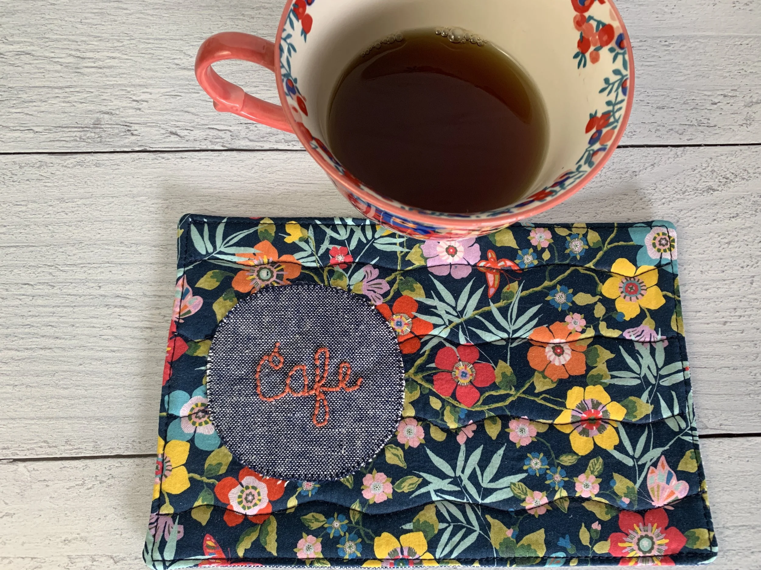 I made this mug rug with Liberty Tana Lawn, Essex linen, hand embroidery, appliqué and wavy line quilting.