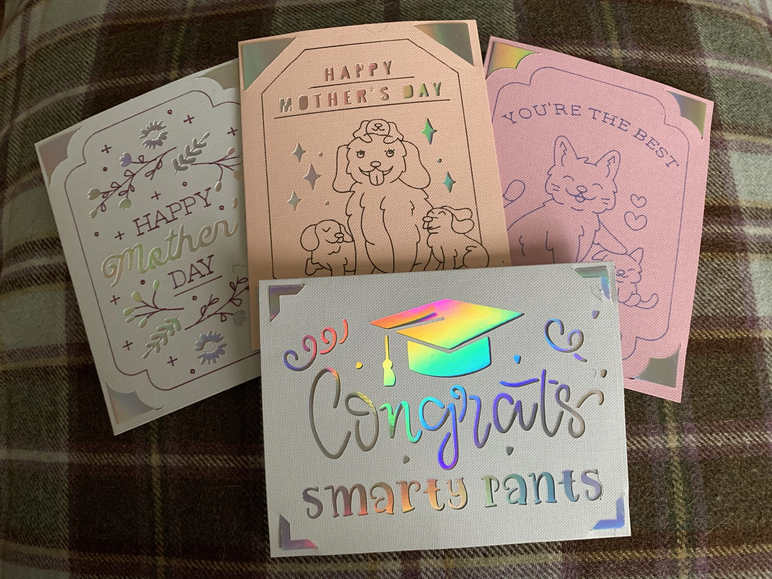 These were so quick and fun to make with my Cricut Joy. You can see the irridescent metallic paper showing through the cut card front.