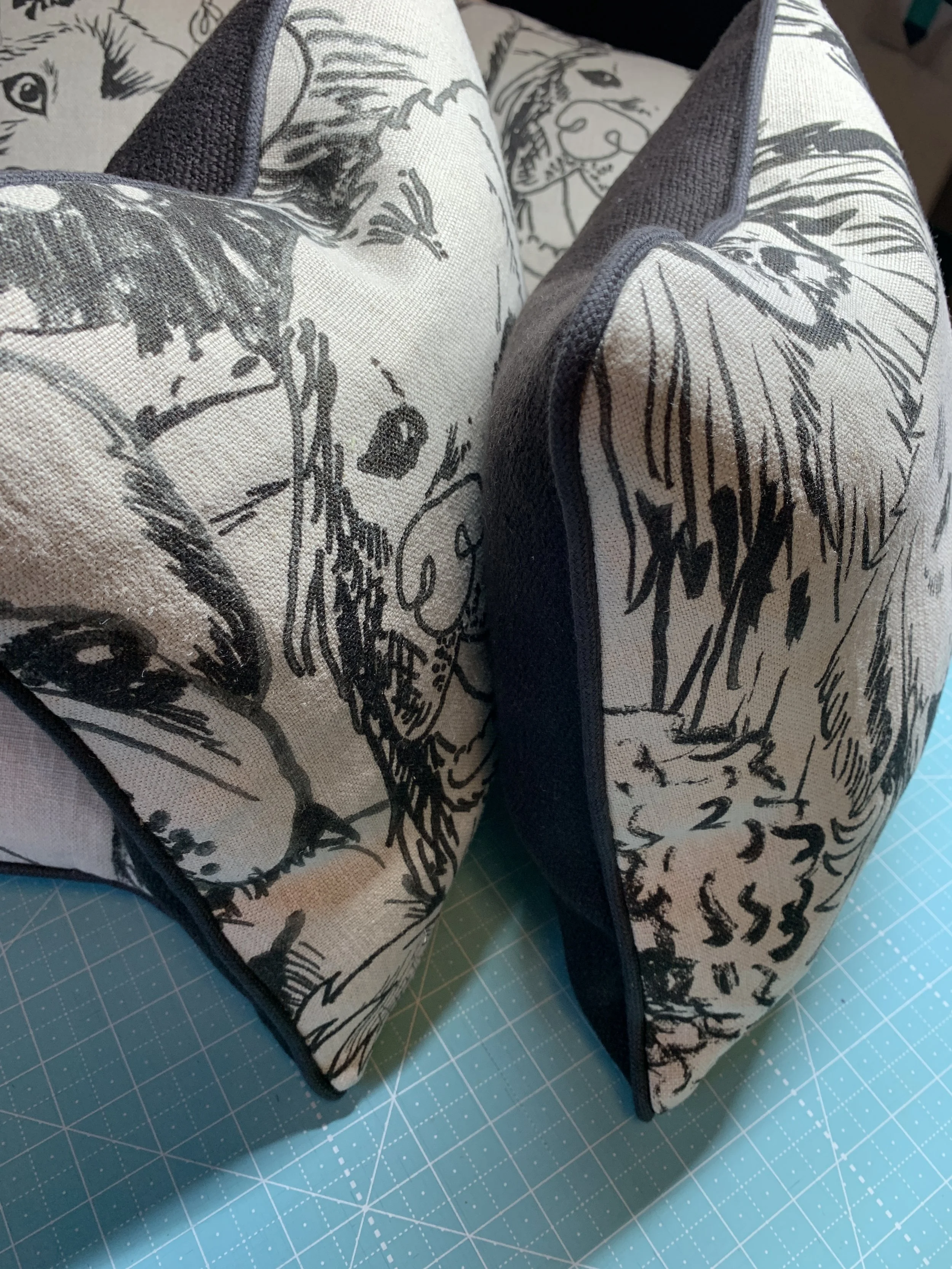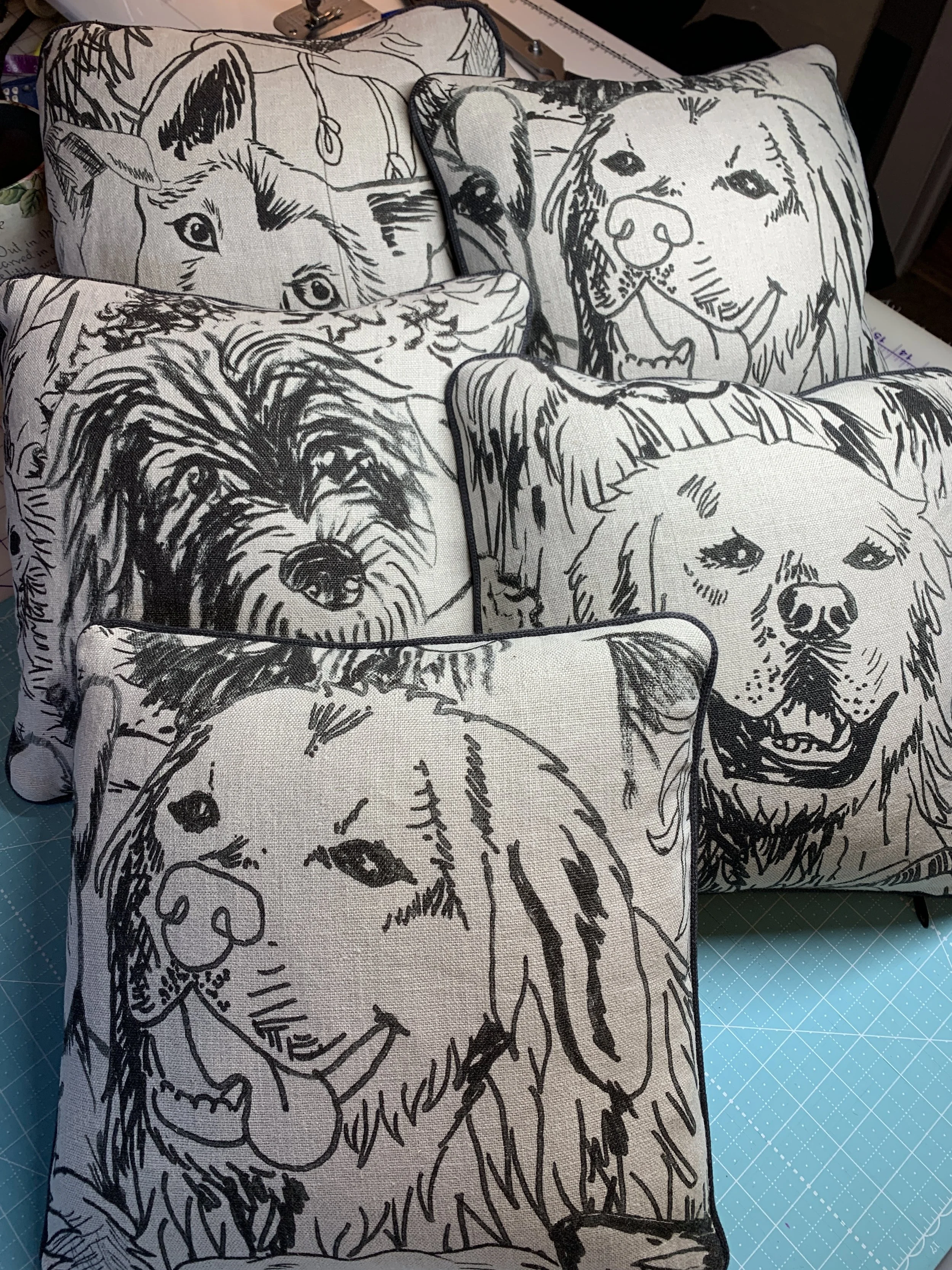 i am so happy to be able to spend lots more time in my sewing studio. The dog pillows commission project is completed and delivered. I am very pleased at how they turned out. These pillows are 13” square finished size with decorative cording, invisible zipper enclosure, fussy cut front fabric and contrast fabric on back of pillow.