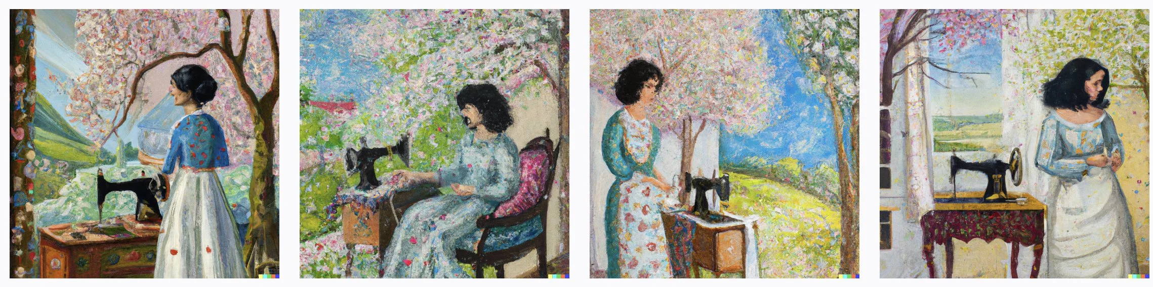 Then I wanted an impressionist painting of a woman with black hair hand sewing with her staffordshire Shepard dog in a field of poppies. It gave me black colored dogs, so I redid the query with a brown dog description. I got better looking dogs, but worse looking compositions - the first grouping was the best.